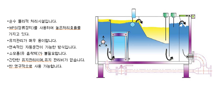 됩니다. 이러한 물과 기름과의 부력차이와 다수의 물결모양의 칸막이를 수직으로 설치하여 물, 기름, 슬러지의 부력차이를 이용하여 분리